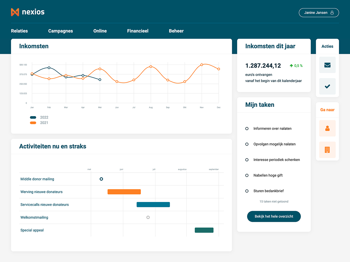 Het CRM van Nexios biedt ondersteuning voor de volledige workflow van lead tot en met donatiefactuur. Alle lopende aanvragen en overeenkomsten staan centraal. Genereer een brief of verstuur een e-mail direct vanuit de relatie.